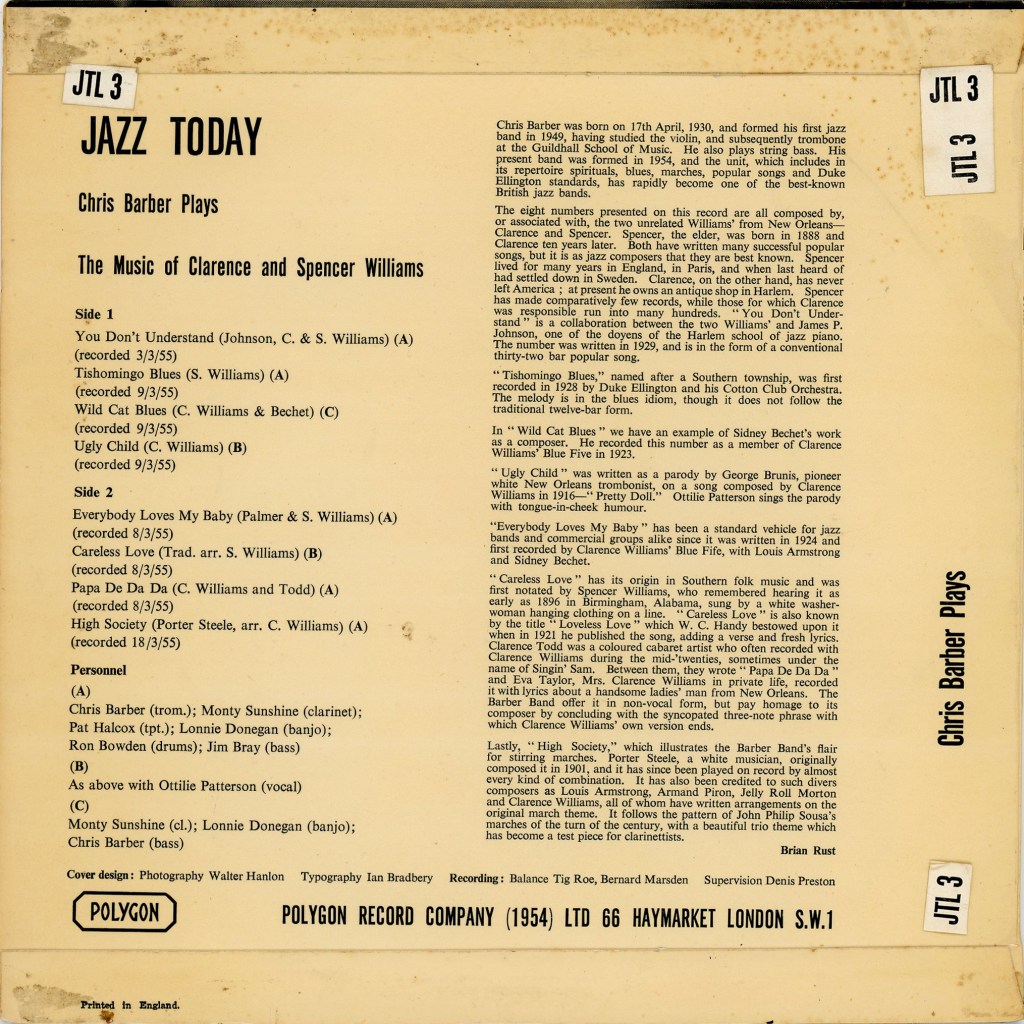 Chris Barber (trom.); Monty Sunshine (clarinet); Pat Halcox (tpt.); Lonnie Donegan (banjo); Ron Bowden (drums); Jim Bray (bass)