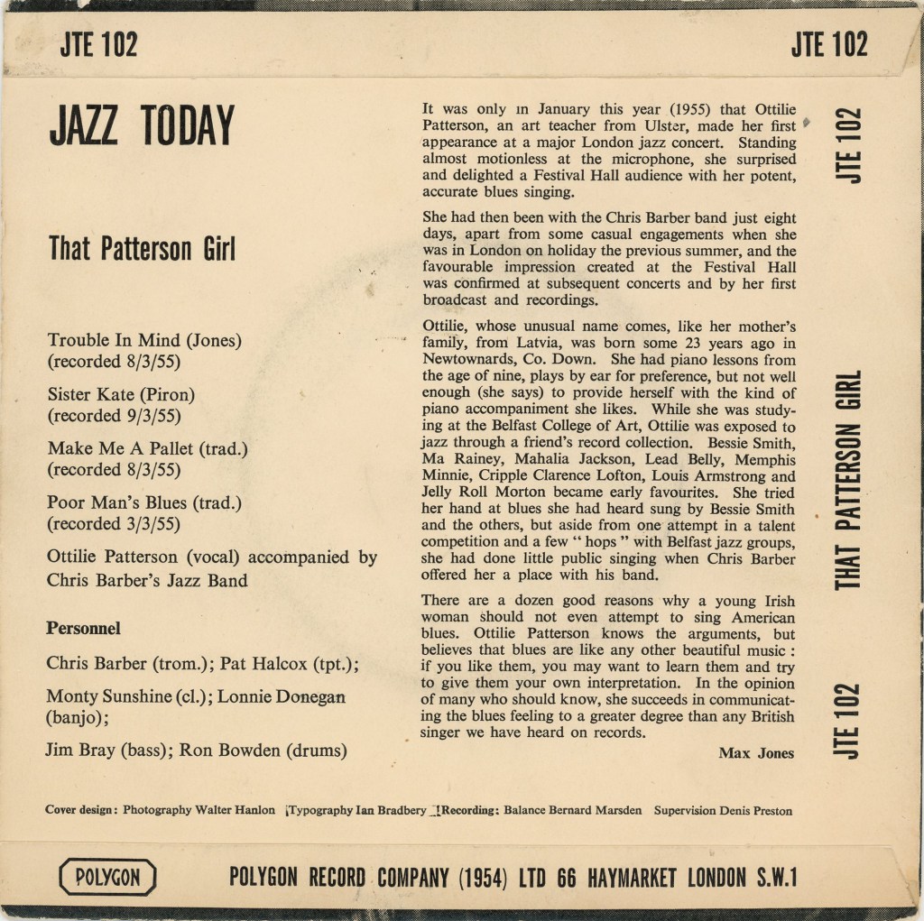 OTTILIE PATTERSON POLY. JT102. Oh that Bessie Smith could have recorded with the same equipment as Miss Patterson did on this EP, not that she would have “carved” Miss Patterson up, for I predict that one day this young girl from the Emerald Isle will rank alongside Betty and Ma Rainey. This EP will corroborate my statement, well backed up by the Chris Barber Group Ottilie sings four standards of which “Trouble in mind” and “Sister Kate” are the most outstanding. Congratulations also go to Bernard Marsden the man behind the fine quality of this recording.