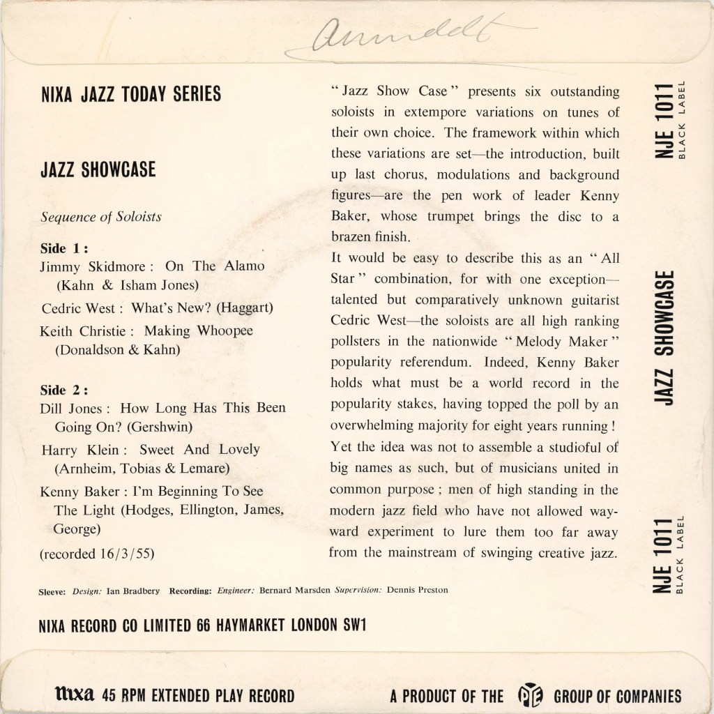 “Jazz Show Case” presents six outstanding soloists in extempore variations on tunes of their own choice. The framework within which these variations are set – the introduction, built up last chorus, modulations and background figures – are the pen work of leader Kenny Baker, whose trumpet brings the disc to a brazen finish.