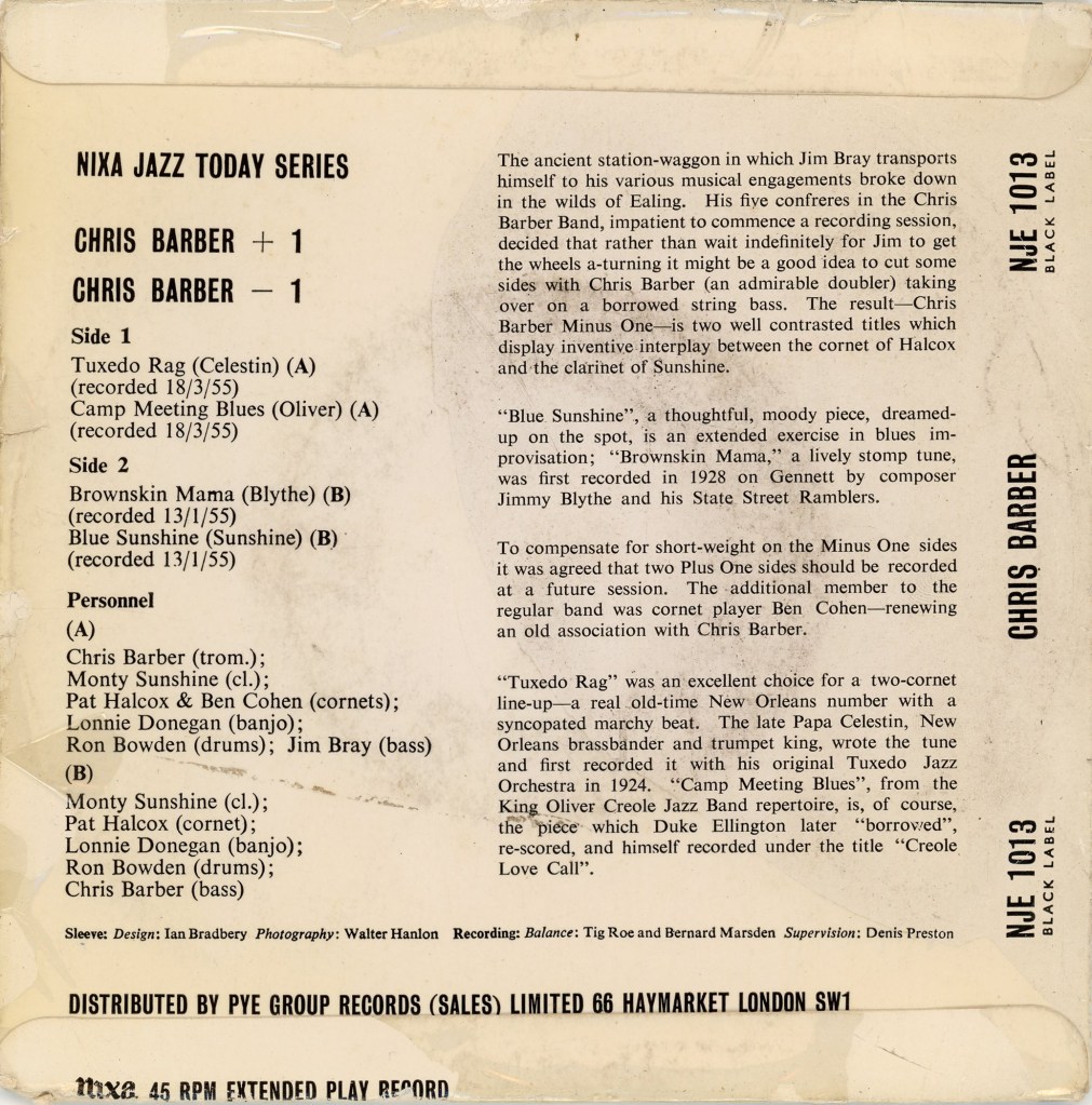 To compensate for short-weight on the Minus One sides it was agreed that two Plus One sides should be recorded at a future session. The additional member to the regular band was cornet player Ben Cohen – renewing an old association with Chris Barber.