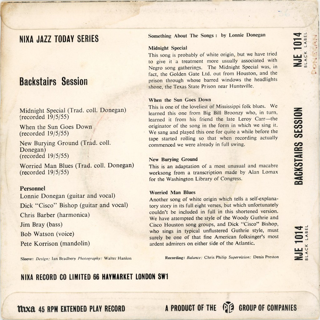 Nobody knew it by Echoes of Harlem was the last Barber band album to feature Lonnie plunking his banjo. None of its tracks had been given over to the skiffle group because Denis Preston had been perspicacious enough to take them into IBC Studio in Portland Place to record their own extended player, Backstairs Session. Juxtaposing the relatively obscure New Burying Ground and When The Sun Goes Down with skiffle anthems Midnight Special and Worried Man Blues, it was a commercial enough package but was ignored or overlooked by most reviewers and radio programmers, and consequently by most record buyers.