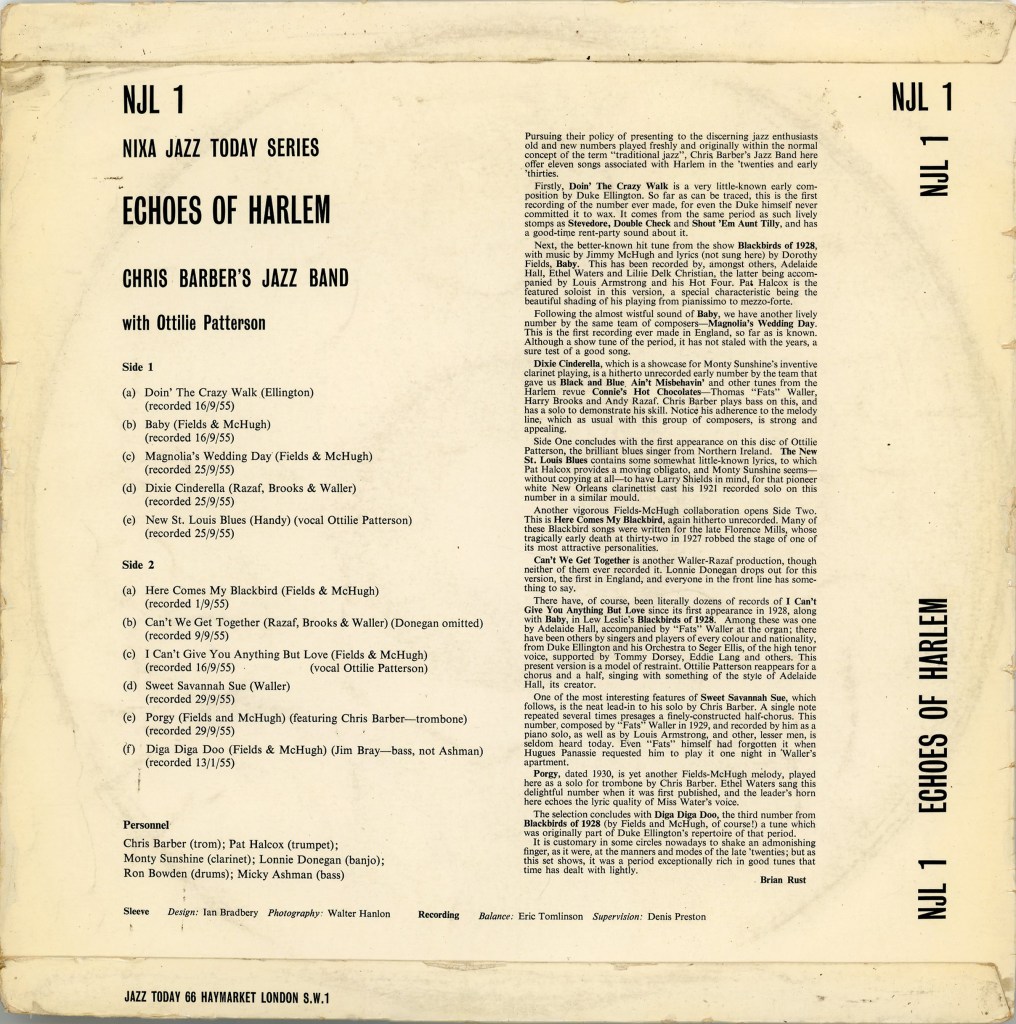 Pursuing their policy of presenting to the discerning jazz enthusiasts old and new numbers played freshly and originally within the normal concept of the term “traditional jazz”, Chris Barber’s Jazz Band here offer eleven songs associated with Harlem in the ‘twenties and early thirties.