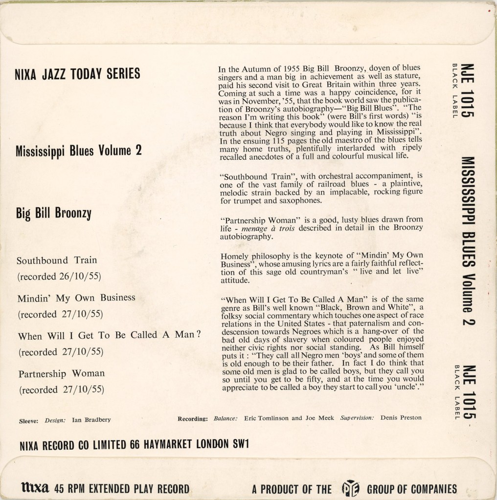 “When Will I Get To Be Called A Man” is of the same genre as Bill’s well known “Black, Brown and White”, a folksy social commentary which touches one aspect of race relations in the United States – that paternalism and condescension towards Negroes which is a hang-over of the bad old days of slavery when coloured people enjoyed neither civic rights nor social standing. As Bill himself puts it: “They call all Negro men ‘boys’ and some of them is old enough to be their father. In fact I do think that some old men is glad to be called boys, but they call you so until you get to be fifty, and at the time you would appreciate to be called a boy they start to call you ‘uncle’.”