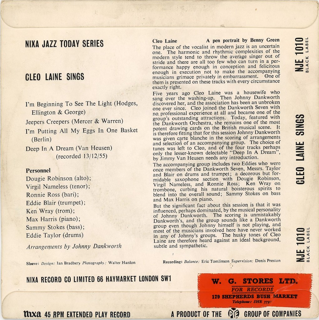 Five years ago Cleo Laine was a housewife who sang over the washing-up. Then Johnny Dankworth discovered her, and the association has been an unbroken one ever since. Cleo joined the Dankworth Seven with no professional experience at all and became one of the group’s outstanding attractions. Today, featured with the Dankworth Orchestra, she remains one of the most potent drawing cards on the British musical scene. It is therefore fitting that for this session Johnny Dankworth was given carte blanche in the scoring of arrangements and selection of an accompanying group. The choice of tunes was left to Cleo, and of the four tracks perhaps only the lesser-known delectable “Deep In A Dream”, by Jimmy Van Heusen needs any introduction.