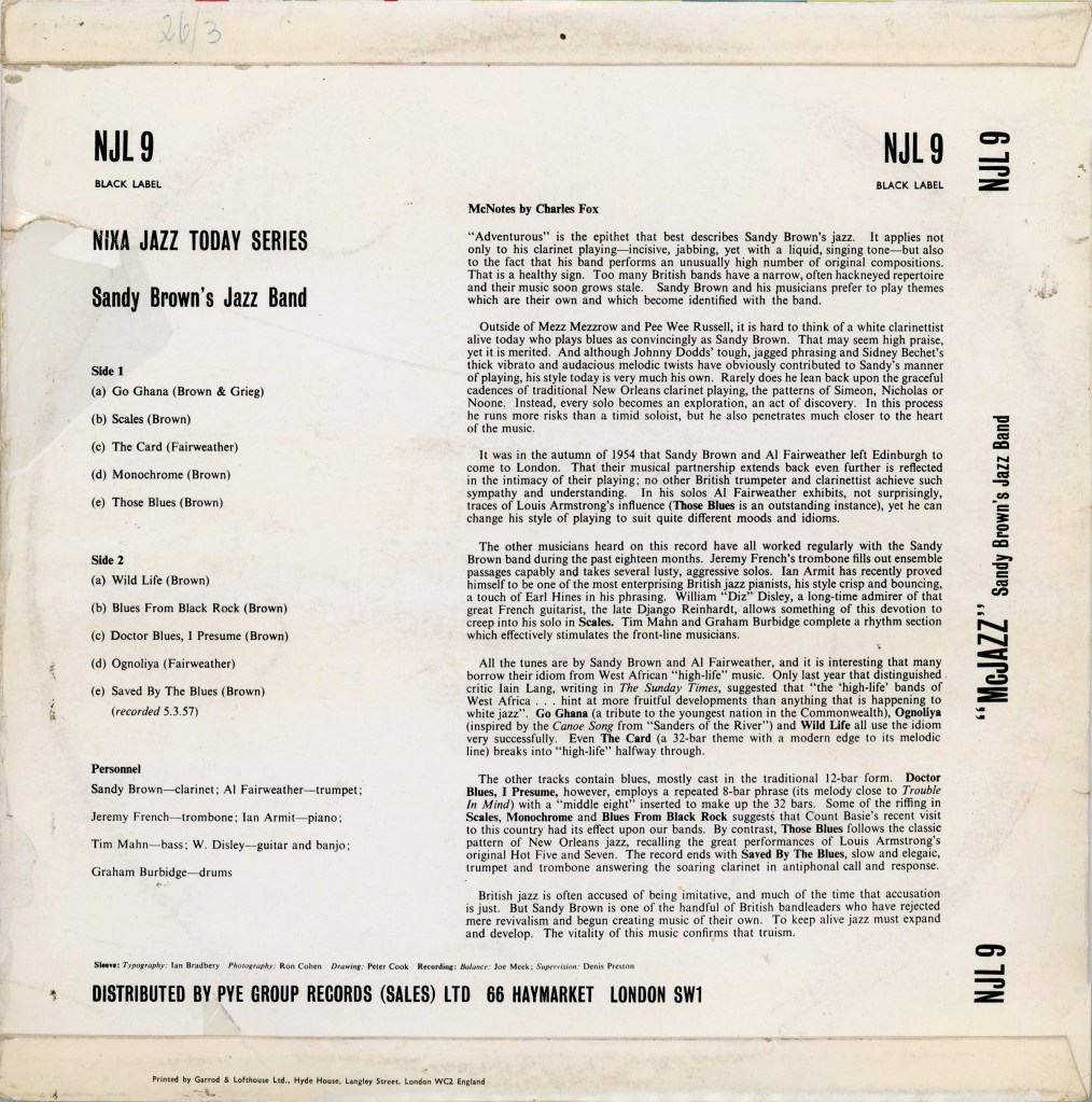 British jazz is often accused of being imitative, and much of the time that accusation is just. But Sandy Brown is one of the handful of British bandleaders who have rejected mere revivalism and begun creating music of their own. To keep alive jazz must expand and develop. The vitality of this music confirms that truism.