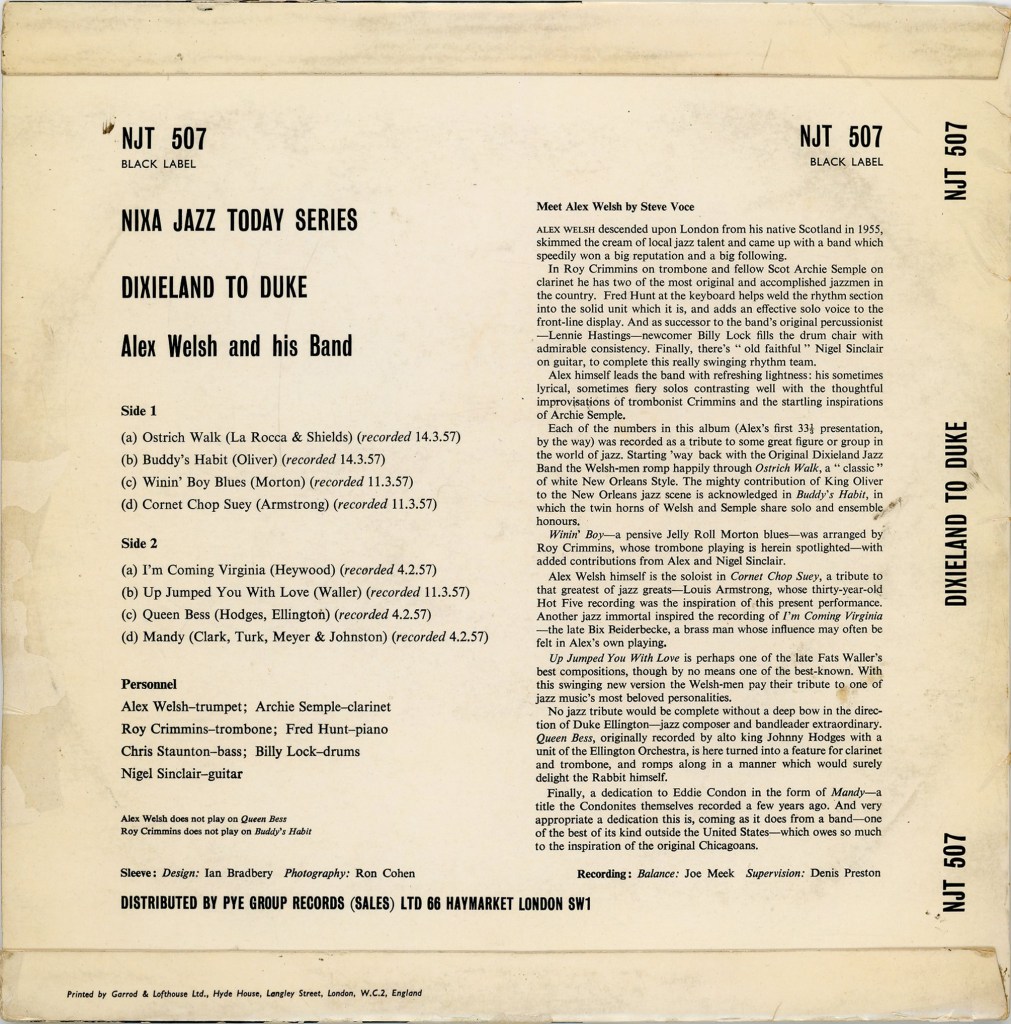 Each of the numbers in this album (Alex’s first 33-1/2 presentation, by the way) was recorded as a tribute to some great figure or group in the world of jazz. Starting ‘way back with the Original Dixieland Jazz Band the Welsh-men romp happily through Ostrich Walk, a “classic” of white New Orleans Style. The mighty contribution of King Oliver to the New Orleans jazz scene is acknowledged in Buddy’s Habit, in which the twin horns of Welsh and Semple share solo and ensemble honours.